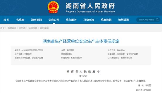 2月27日上午,湖南省發布了《湖南省生產經營單位安全生產主體責任規定》。標志著從3月1日起,將開始實行企業生產經營單位負責人安全責任終身追究制度。