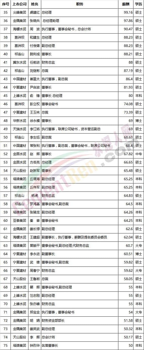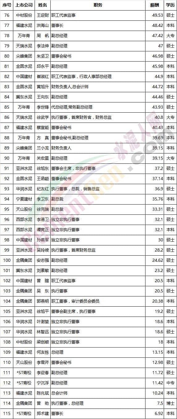 上數據僅為部分上市企業的高管年薪,同時因為部分水泥企業高管就職于集團公司,而不從上市公司領取薪金,因此以上排名尚有不足之處,僅供參考。( 1港元=0.81元人民幣換算)。