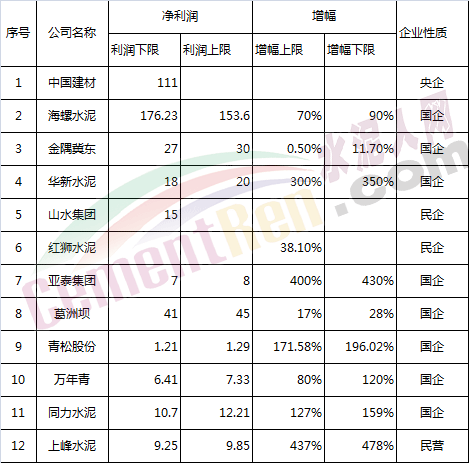 從部分水泥的業(yè)績預(yù)告來看,按照業(yè)績增長下限,已公布業(yè)績的部分國營水泥企業(yè)利潤總額約為398.55億,占了整個行業(yè)總利潤的45.4%,這只是已公布的水泥上市公司的業(yè)績預(yù)告,這其中還沒包括沒有出業(yè)績預(yù)報的福建水泥、華潤水泥等一部分水泥企業(yè)的業(yè)績。
