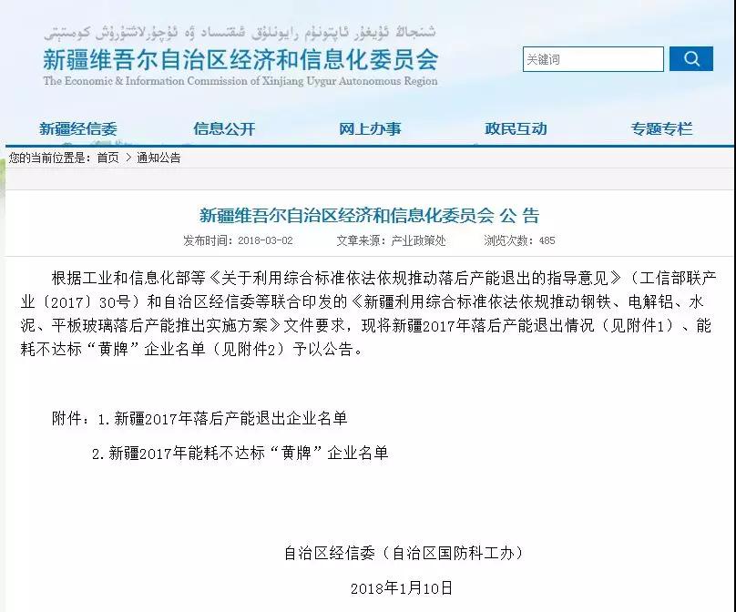 【水泥人網】日前,新疆維吾爾自治區經濟和信息化委員會發布公告,公告稱根據工業和信息化部等《關于利用綜合標準依法依規推動落后產能退出的指導意見》(工信部聯產業〔2017〕30號)和自治區經信委等聯合印發的《新疆利用綜合標準依法依規推動鋼鐵、電解鋁、水泥、平板玻璃落后產能推出實施方案》文件要求,將新疆2017年落后產能退出情況、能耗不達標“黃牌”企業名單予以公告。