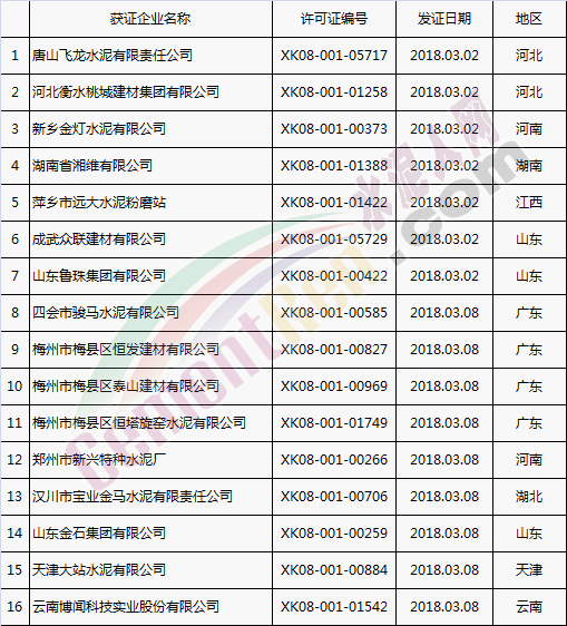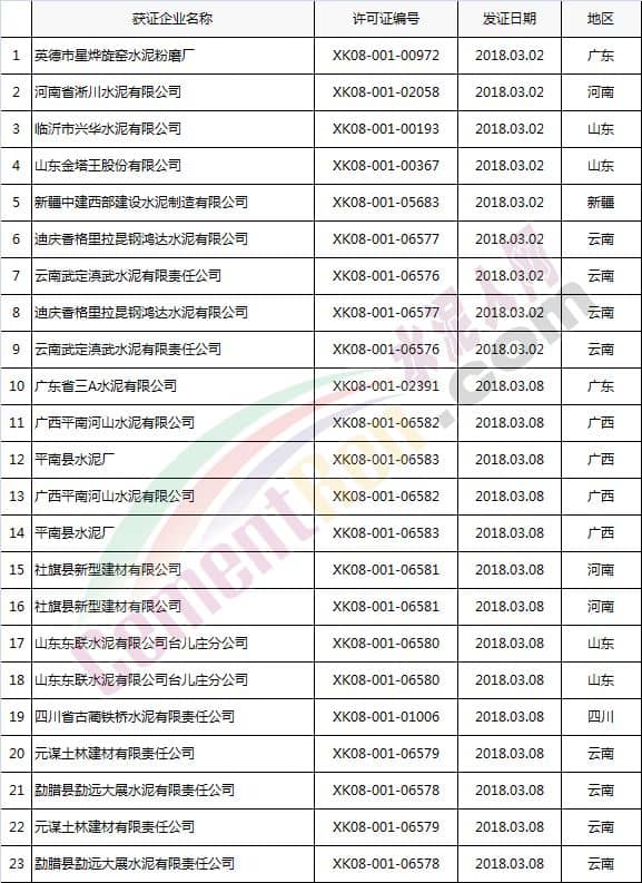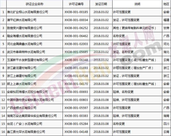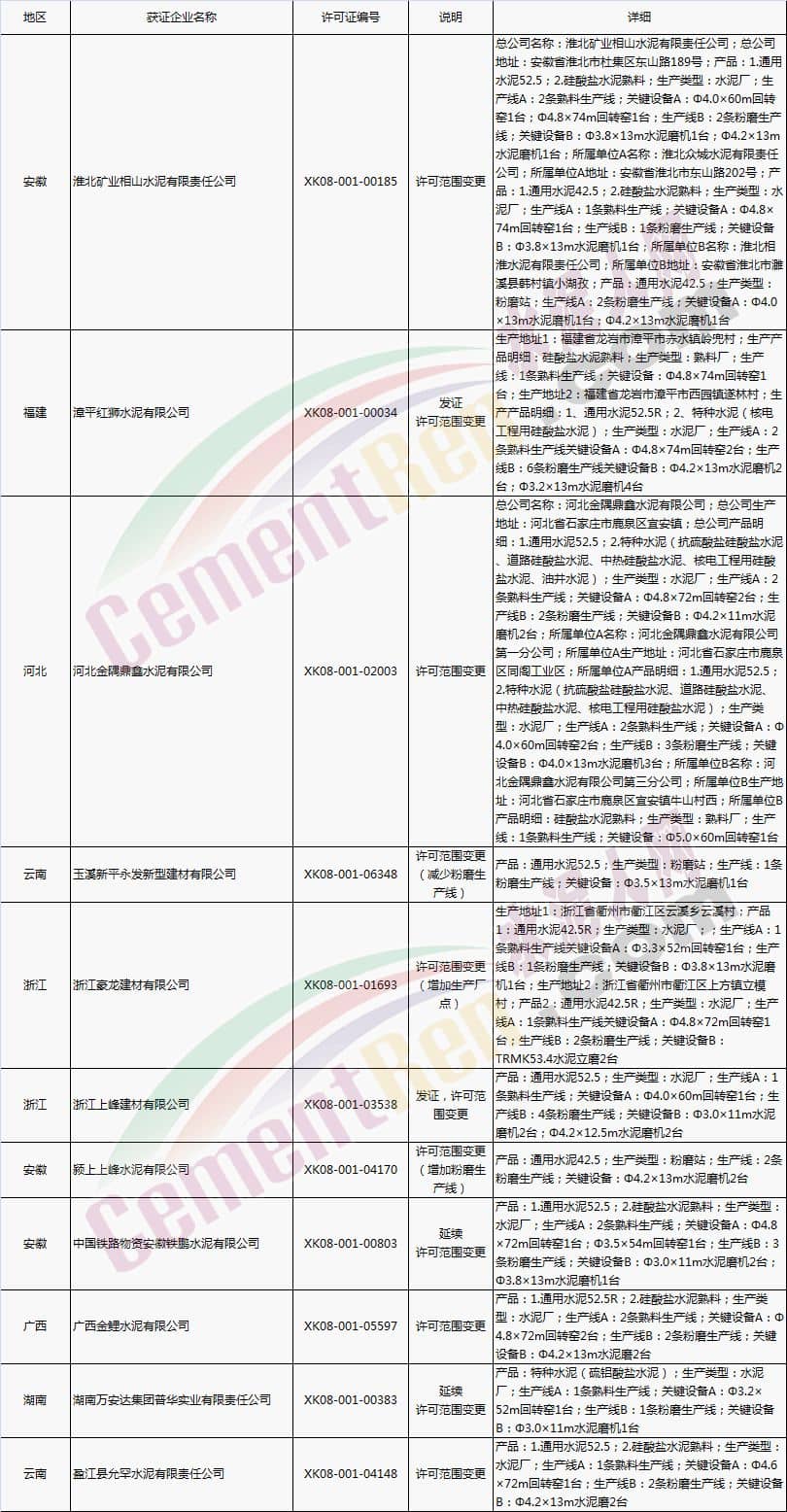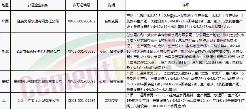 【水泥人網】國家質檢總局于本月2日、8日分別放發本月第1批和批2批水泥企業生產許可證。其中涉及新發證書的23家,涉及到期延續的16家企業,涉及變更的16家企業。 一、發證 二、到期延續 三、涉及變更 以上涉及變更的企業中,涉及名稱變更的共四家企業,許可范圍變更11家企業, 一、名稱變更 二、許可范圍變更 三、其他(更換帶有熟料單元的證書)
