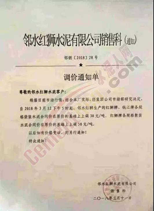 川東區域主導企業鄰水紅獅水泥調價通知稱:根據目前市場行情,結合本廠實際,經集團公司市場部研究決定,自3月12日下午5時起,上調紅獅牌、錢江牌各規格袋裝水泥合同價在原價的基礎上上調30元/噸,紅獅牌各規格散裝水泥合同價在原價基礎上上調50元/噸。通知文原文如下