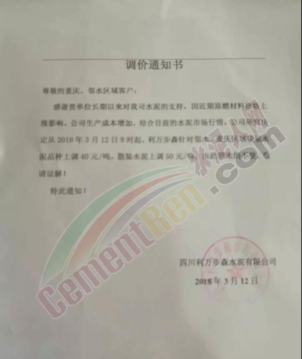 另據水泥人網重慶通訊員消息,自昨日(12日)起,重慶主城區企業陸續發布通知上調水泥出廠價,上調幅度也在30-50元/噸。