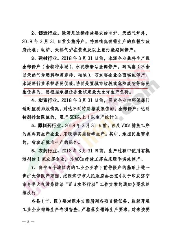 2018 年 3 月 31 日前,水泥企業熟料生產線全部停產(含特種水泥),水泥粉磨站全部停產,磚瓦窯(不含 以天然氣為燃料和蒸養磚、砌塊)、石灰窯企業全面實施停產。