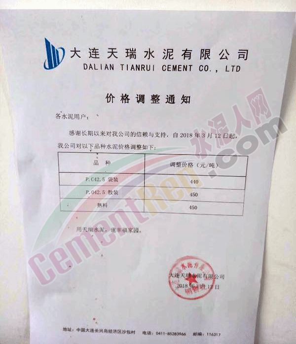 3月12日,遼寧大連地區主導企業發布提價通知,各標號水泥統一上調100元/噸。調價后PO42.5散裝水泥出廠價450元/噸,PC42.5袋裝水泥出廠價440元/噸。