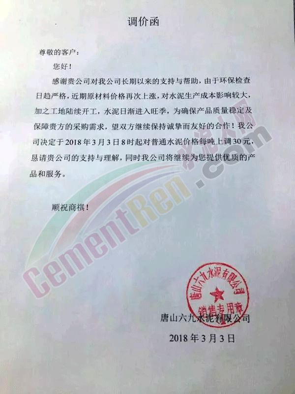 3月3日唐山六九水泥有限公司發調價函稱,由于環保檢查日趨嚴格,近期原材料價格再度上漲,對水泥生產成本影響較大,加之工地陸續開工,水泥日漸進入旺季,為確保產品質量穩定及保障下游客戶采購需求,公司決定對普通水泥價格上調30元/噸。