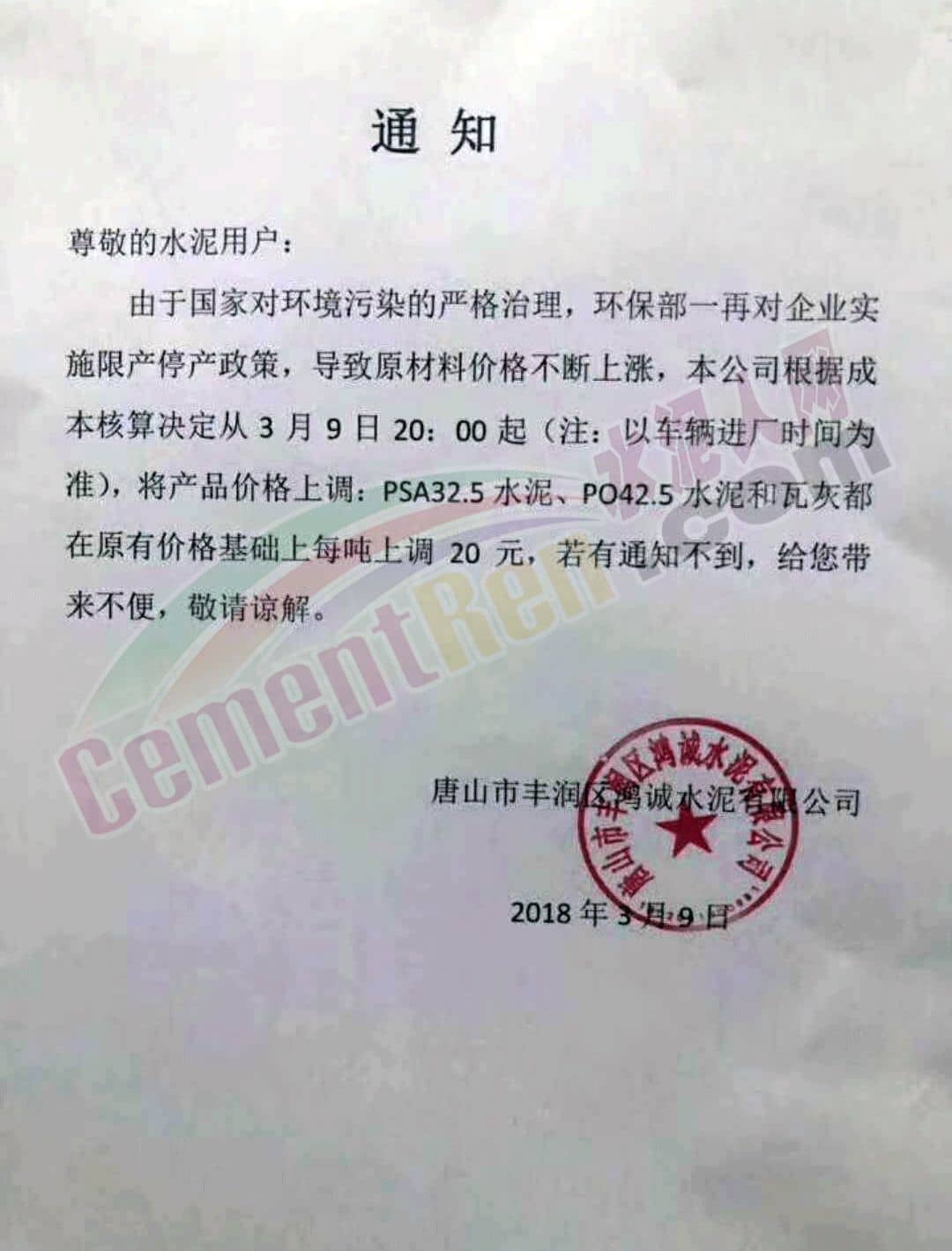 3月9日唐山市豐潤區鴻誠水泥有限公司發布通知稱由于國家對環境污染的嚴格治理,環保部一再對企業實施限產停產政策,導致原材料價格不斷上漲,公司根據成本核算決定自3月9日20:00起水泥價格在原有價格基礎上上調20元/噸。