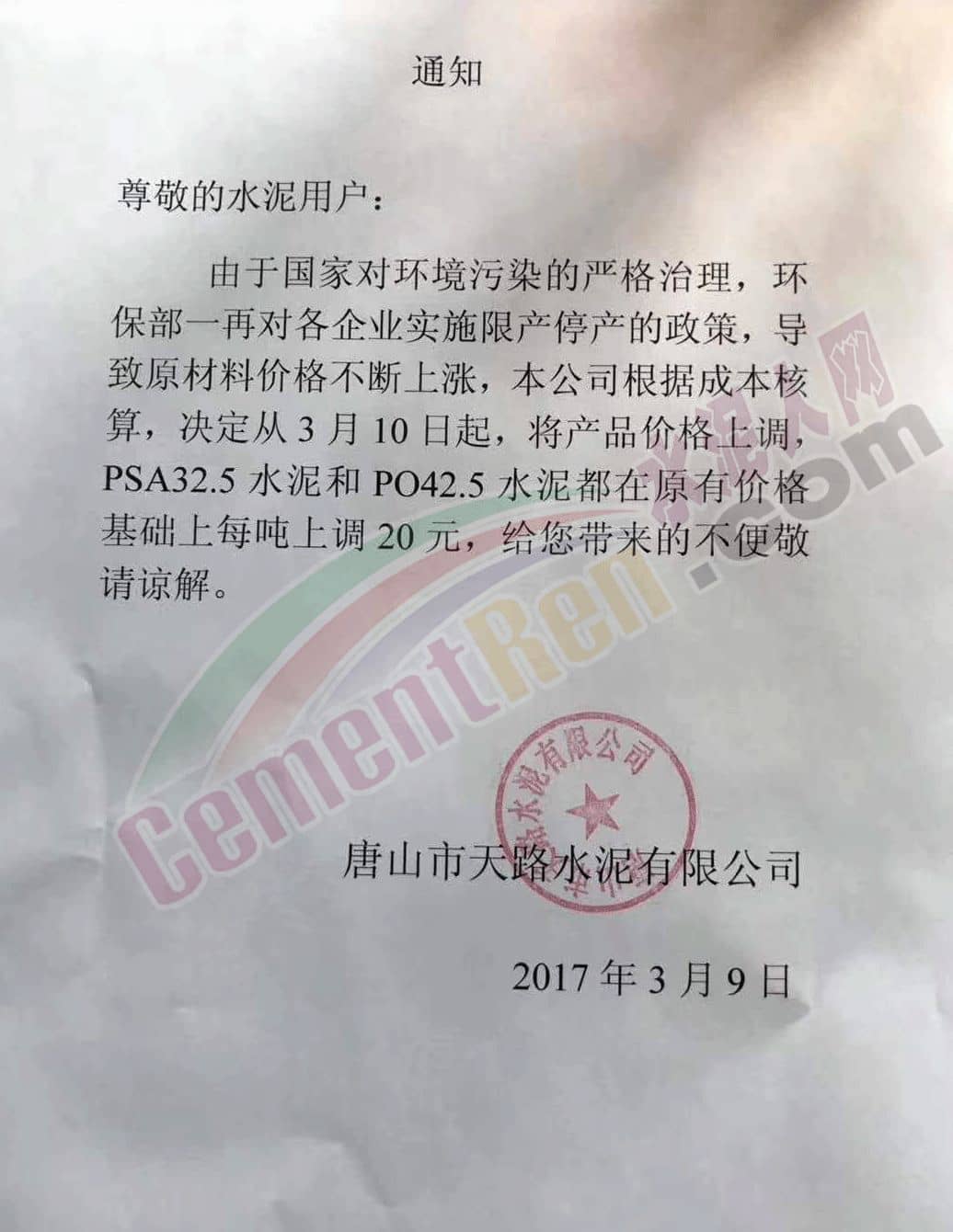 唐山天路水泥有限公司通知,自3月10日起上調PSA32.5和PO42.5水泥價格20元/噸。