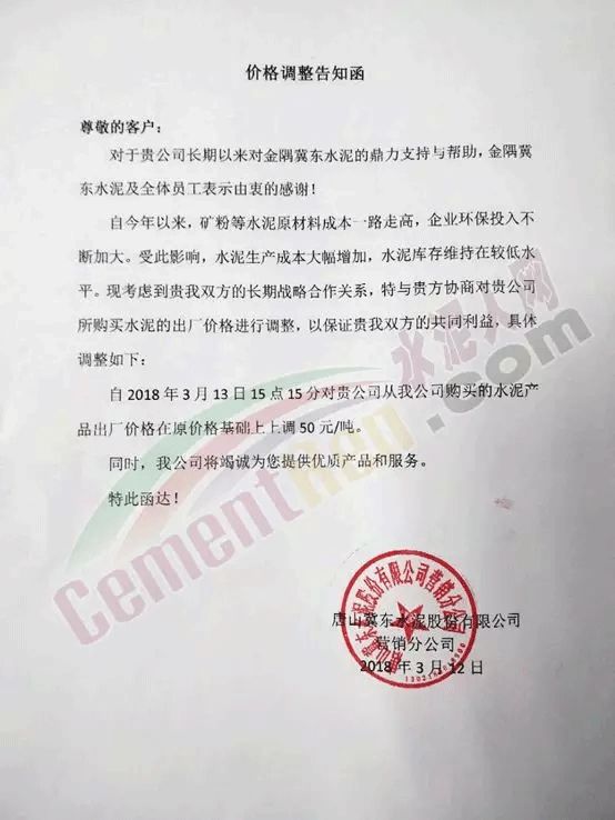 3月12日唐山區域龍頭企業唐山冀東水泥股份有限公司發出價格調整告知函,告知下游客戶因礦粉等原材料成本一路走高,企業環保投入不斷加大,水泥生產成本增加,水泥庫存維持在較低水平,為保證正常的銷售供應自3月13日起各標號水泥出廠價上調50元/噸。