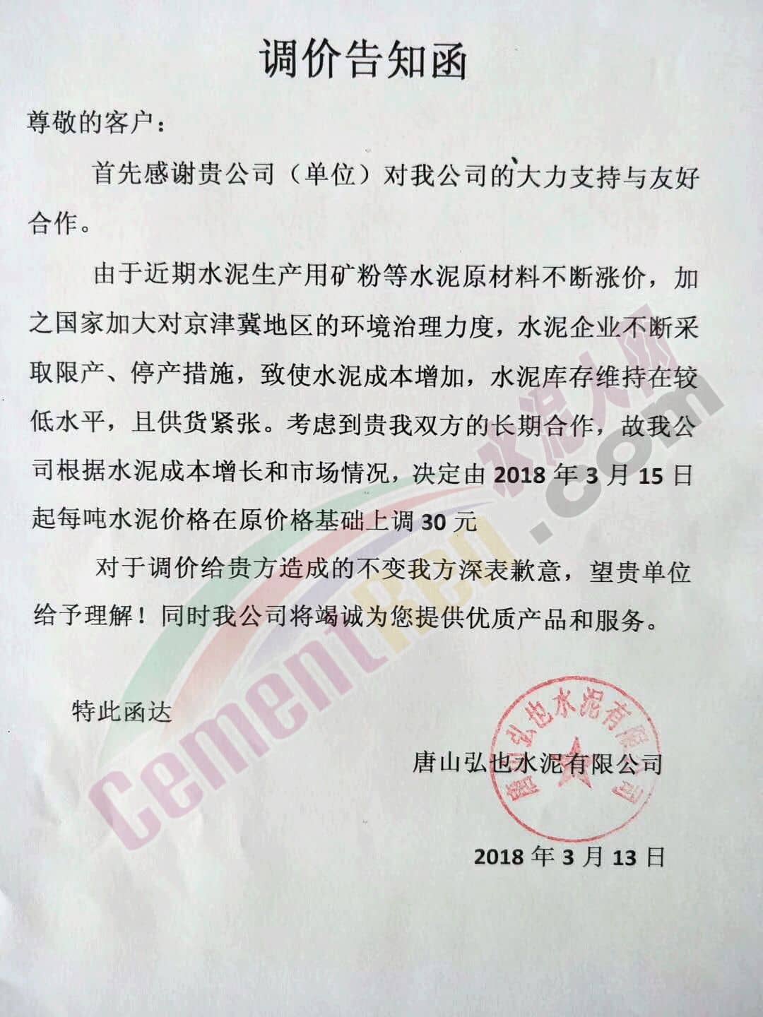 3月13日,唐山弘也水泥發布調價通知,決定自3月15日起每噸水泥價格在原價格基礎上上調30元/噸。