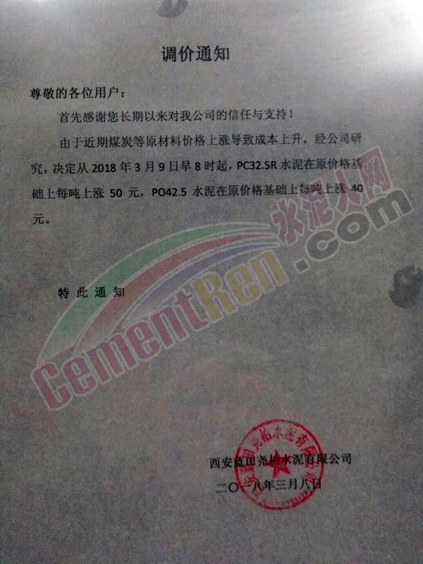3月8日西安藍田堯柏水泥有限公司通知自3月9日8時起PC32.5R水泥上調50元/噸,PO42.5水泥上調40元/噸。