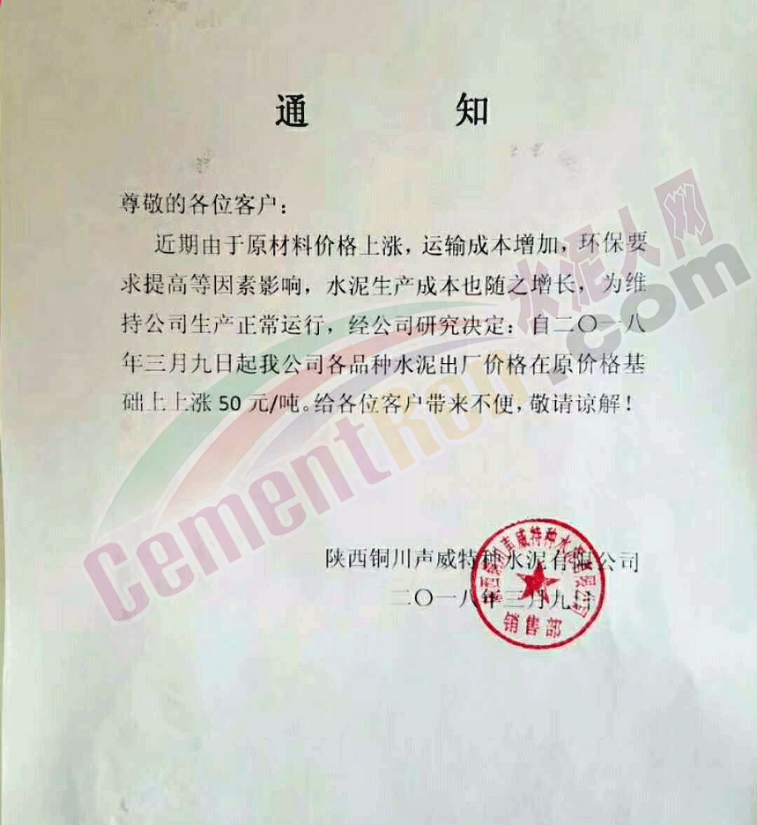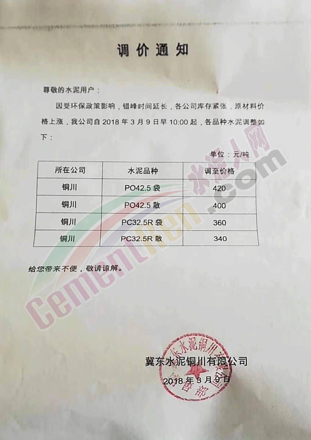 3月9日銅川聲威特種水泥有限公司跟漲,水泥出廠價在原價基礎上調50元/噸。 同時冀東水泥銅川有限公司也發出調價通知稱受環保政策影響,錯峰時間延長,各公司庫存緊張,原材料價格上漲,自3月9日10點起執行新價格。PO42.5散裝水泥400元/噸,PC32.5R袋裝水泥360元/噸。