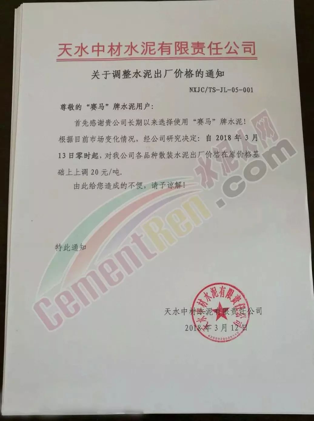 3月12日天水中材水泥有限責任公司通知自3月13日起上調旗下“賽馬”牌水泥出廠價格20元/噸。