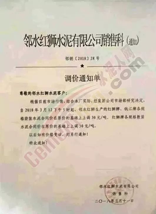 3月11日鄰水紅獅水泥有限公司銷售科發布調價通知自3月12日下午5時起上調旗下紅獅牌、錢江牌各規格袋裝水泥價格30元/噸,紅獅牌各規格散裝水泥上調50元/噸。