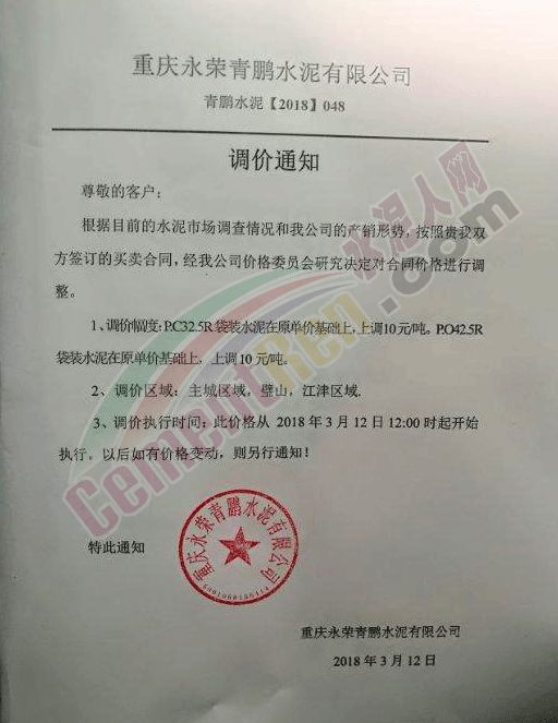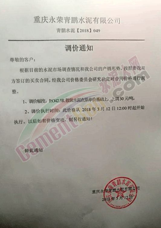 3月12日,重慶永榮青鵬水泥有限公司通知針對同重慶市不同地區水泥價格上調10-50元/噸。
