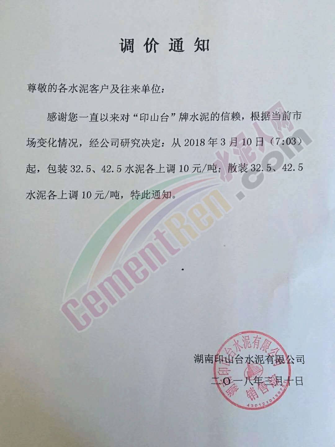 3月10日湖南區域印山臺水泥有限公司通知自3月10日起對旗下各規格水泥價格上調10元/噸。