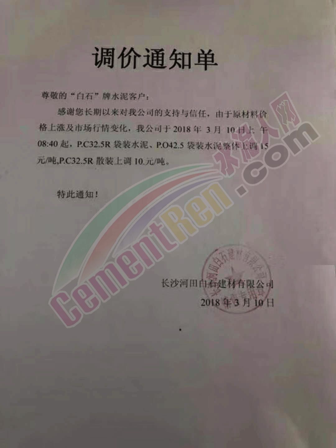 長沙河田白石建材有限公司通知3月10日起對旗下袋裝水泥整體上調15元/噸,P.C32.5R散裝水泥上調10元/噸。