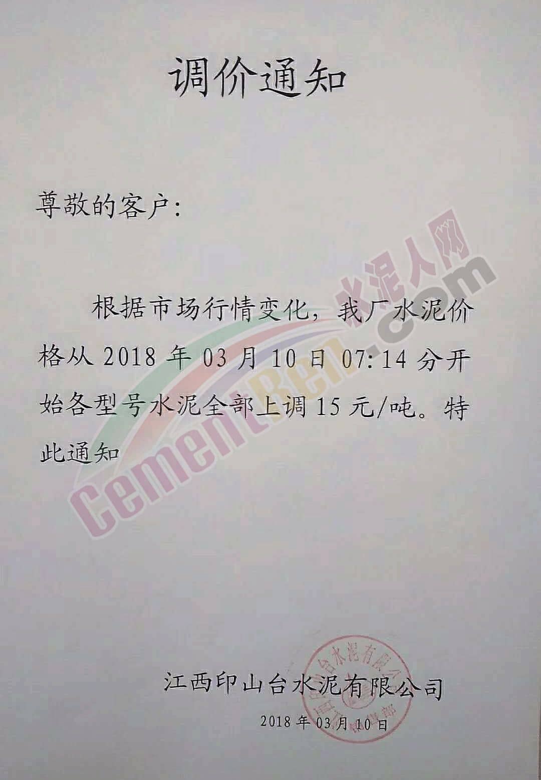 3月10日江西省印山臺水泥通知上調15元 /噸