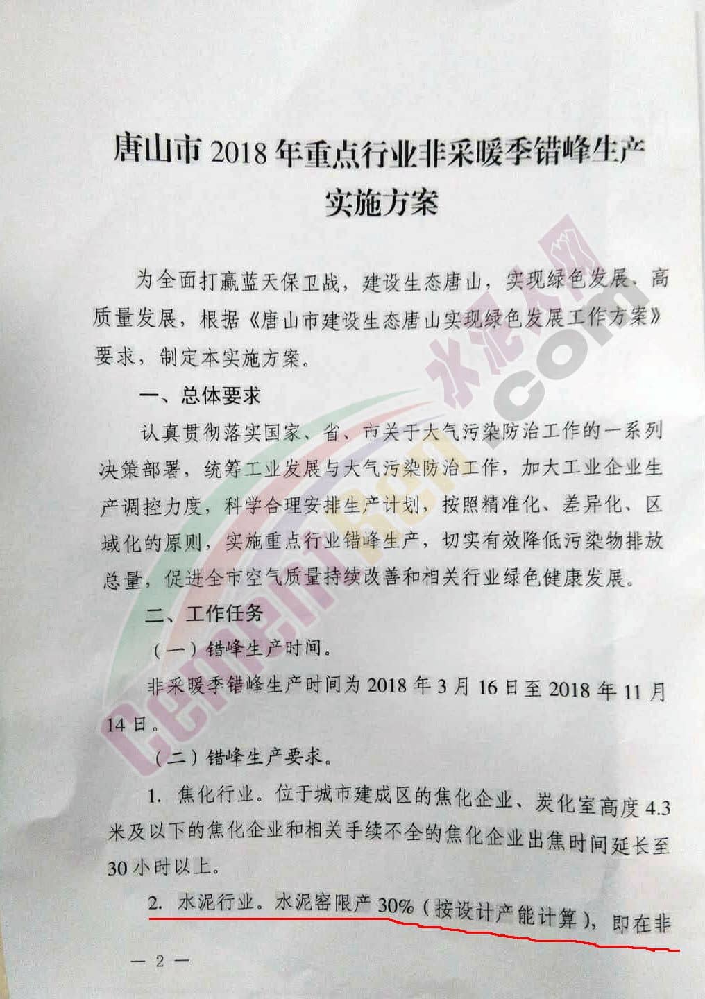 【水泥人網】日前,唐山市人民政府發布《唐山市2018年重點行業非采暖季錯峰生產實施方案》,方案要求水泥等重點行業在非采暖季執行錯峰生產任務,錯峰生產時間為2018年3月16日至2018年11月14日。 其中針對于水泥行業的錯峰生產要求為,水泥窯限產30%(按設計產能計算),即在非采暖季每日生產負荷不得超過設計能力的70%;水泥粉磨站限產30%(按生產天數計算),即在非采暖季每月企業的生產天數不得超過20天。 原文如下: 附:唐山市水泥企業名單