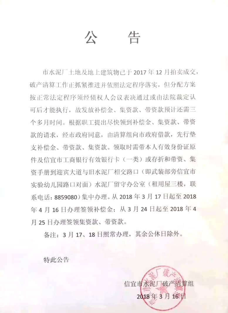 根據有關法律、法規,清算組對水泥廠破產后的職工補償情況等進行了調查,并列出職工補償清單于2017年12月21日予以公示和核對。