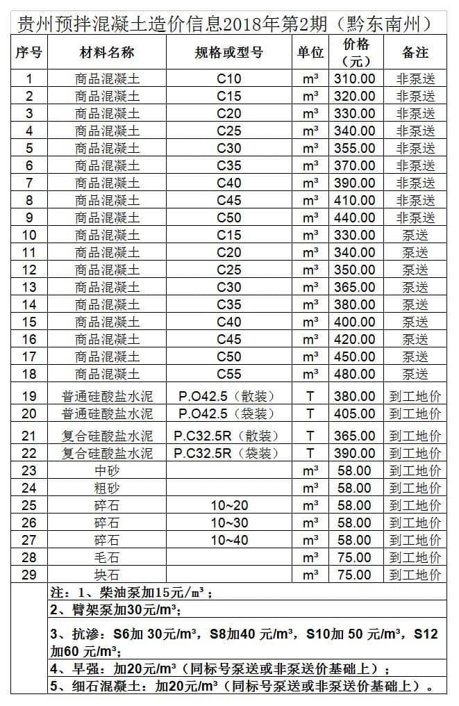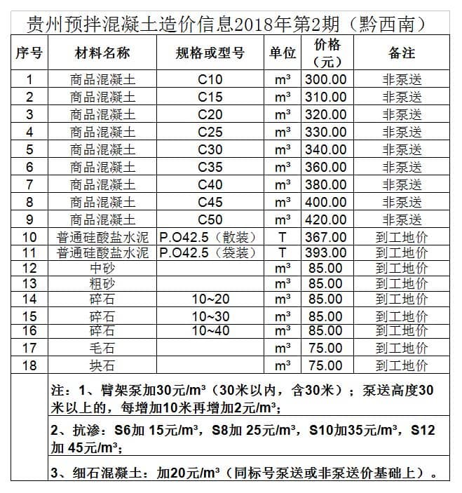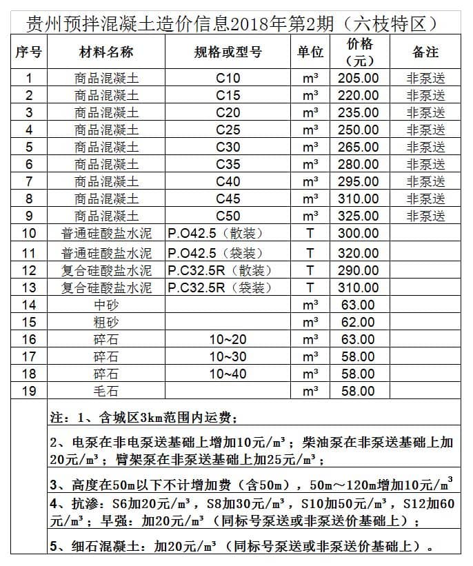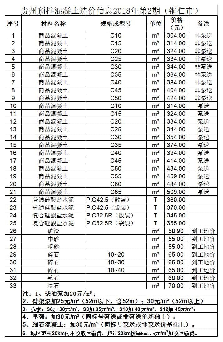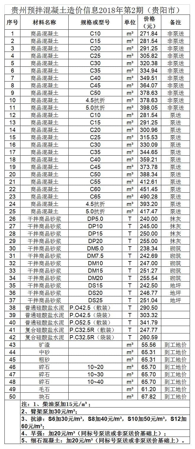 造價 | 貴州省預拌混凝土造價信息2018年第2期