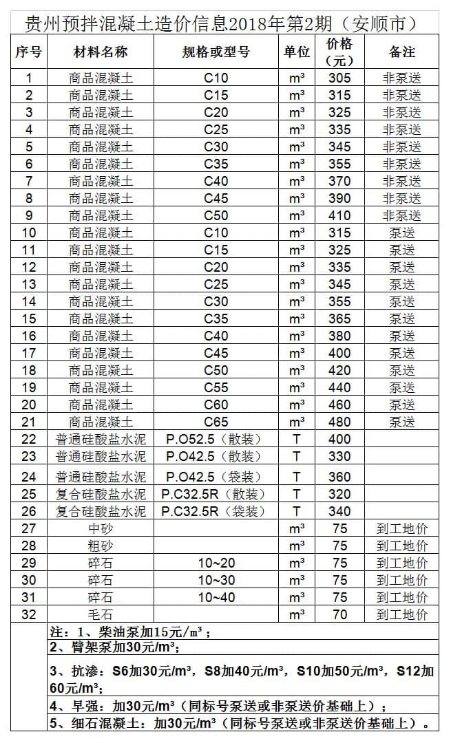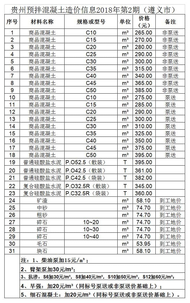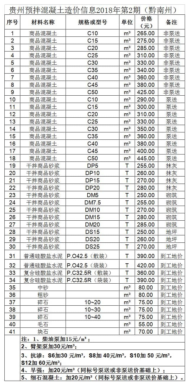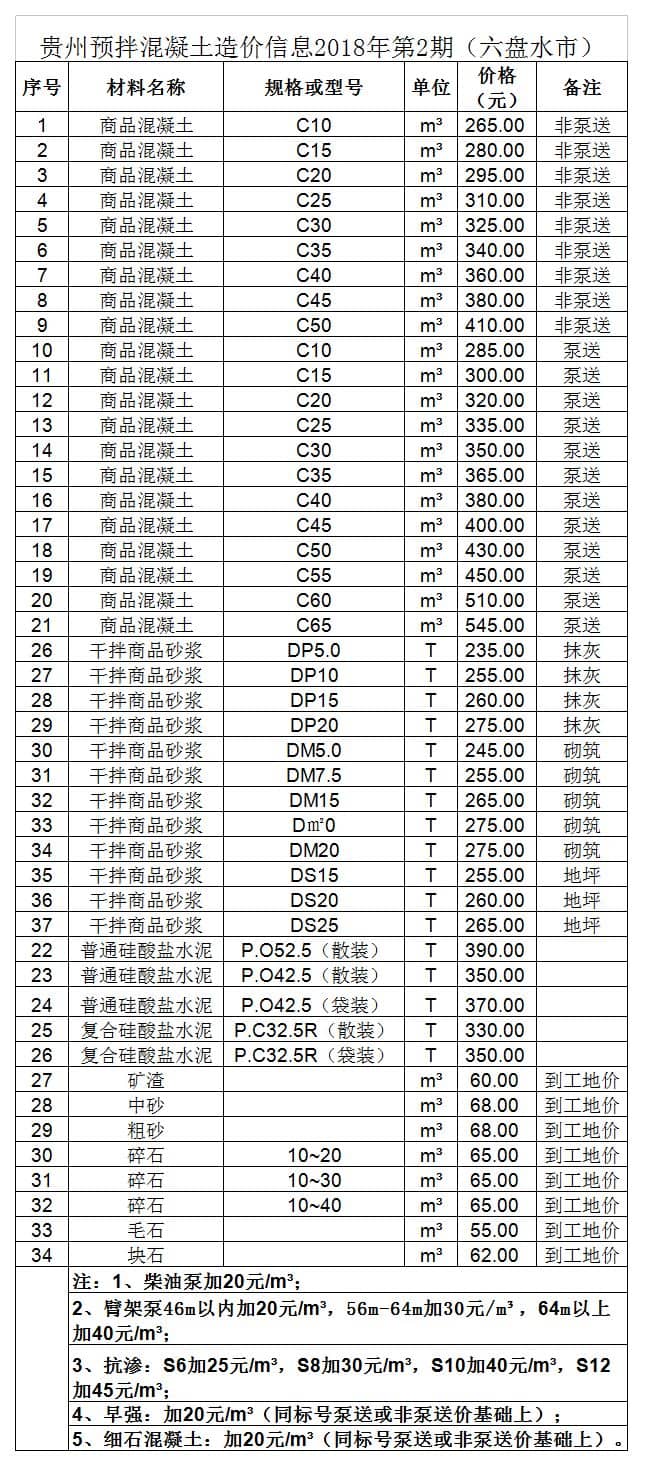 造價 | 貴州省預拌混凝土造價信息2018年第2期