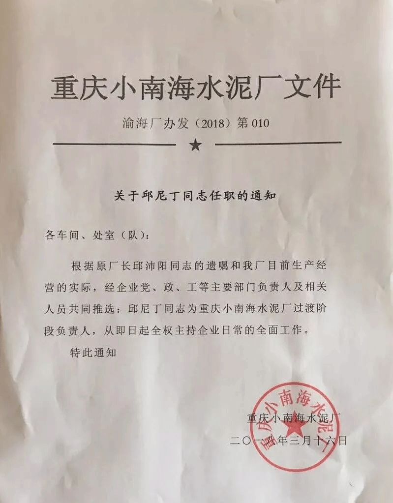 【水泥人網(wǎng)】2018年03月16日,重慶小南海水泥廠廠辦發(fā)布(2018)第010文件:根據(jù)原廠長邱沛陽同志的遺囑,并結(jié)合本廠目前生產(chǎn)經(jīng)營的實(shí)際情況,經(jīng)本廠黨、政、工等主要部門負(fù)責(zé)人及相關(guān)人員共同推選,由邱尼丁同志擔(dān)任重慶小南海水泥廠過渡階段負(fù)責(zé)人,全權(quán)主持企業(yè)日常的全面工作。