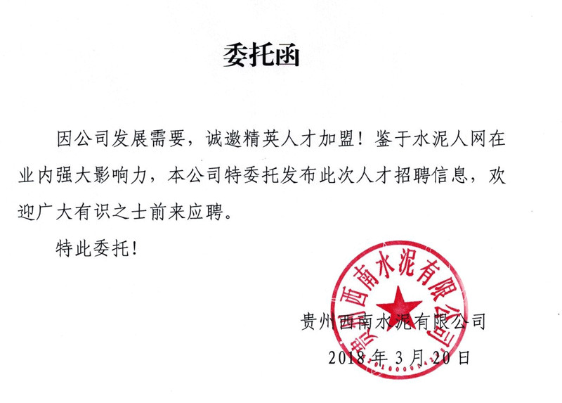 根據企業發展需要,我公司面向社會誠聘水泥工藝、機械電氣、質量控制、安全環保、市場營銷、財務審計、行政人事等各專業的部門經理、業務主管、技術人員。工作內容及福利待遇等具體事項,歡迎您來電咨詢或面議。