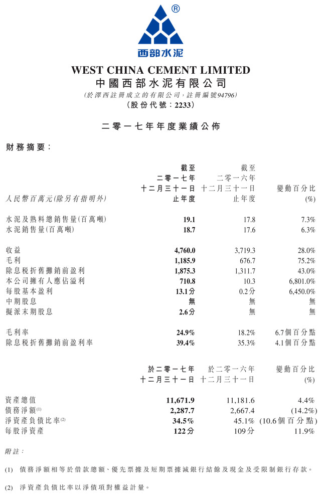 公告顯示,于該年度該公司水泥及熟料總銷售量1910萬噸,同比增長7.3%;水泥銷售量1870萬噸,同比增長6.3%。期間公司毛利率24.9%,同比上升6.7個百分點。于2017年12月31日該集團的產能高達2920萬噸水泥。