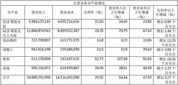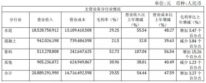 2017年,公司實現(xiàn)水泥和熟料銷售總量6871.6萬噸,同比增長30.4%;銷售骨料1152.6萬噸,同比增長53.8%;環(huán)保業(yè)務(wù)處置總量181.6萬噸,同比增長21%;商品混凝土實現(xiàn)銷量319.3萬方,同比增長11.4%。全年公司實現(xiàn)營業(yè)收入208.89億元,同比增長54.44%;實現(xiàn)利潤總額28.12億元,歸屬于母公司股東的凈利潤20.78億元,分別較上年同期增長248.46%和359.72%。