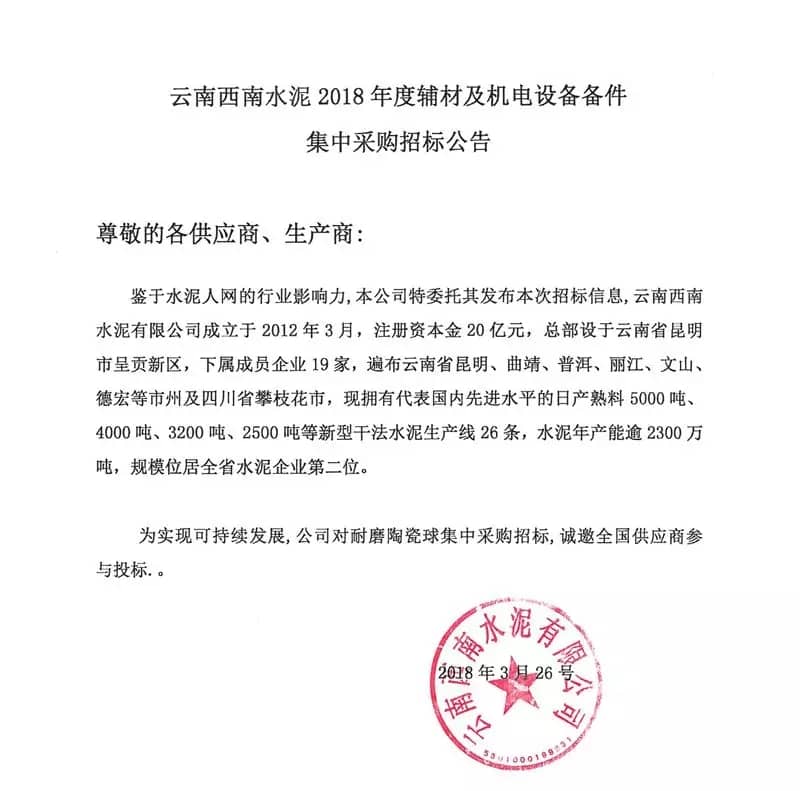 為了做好云南西南下屬19家成員企業2018年度生產用陶瓷耐磨球的招議標采購工作,誠邀云南西南下屬19家成員企業的機電設備原制造供貨廠及其他同類制造企業參加,以滿足云南西南下屬成員企業生產的機電設備備件及輔助材料的需求,共同打造云南西南長期穩定合作、互惠共贏的供應商渠道。現將相關招標采購信息發布如下: