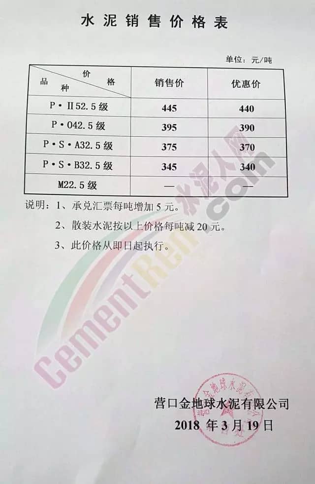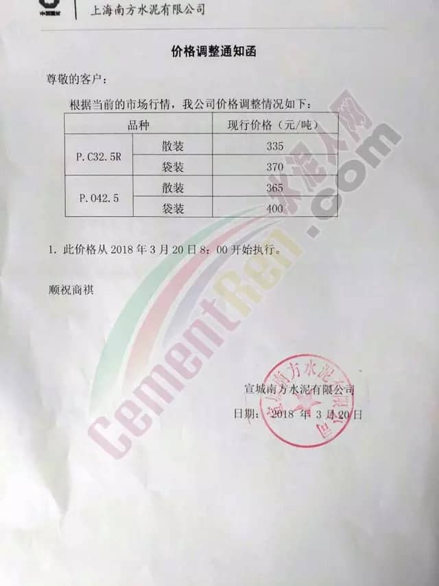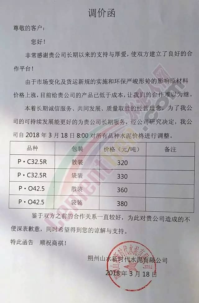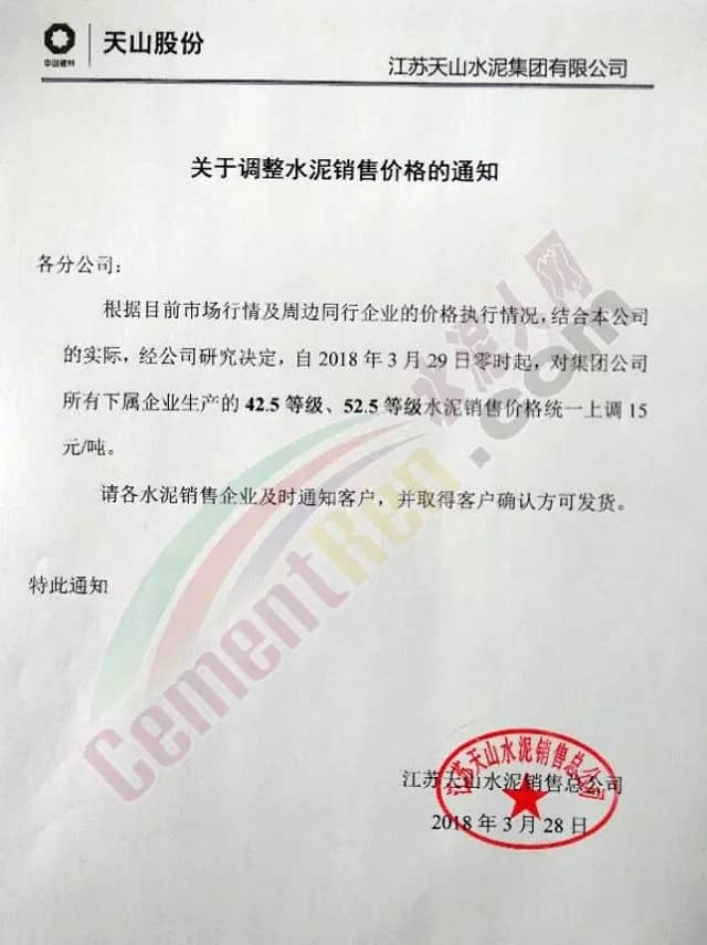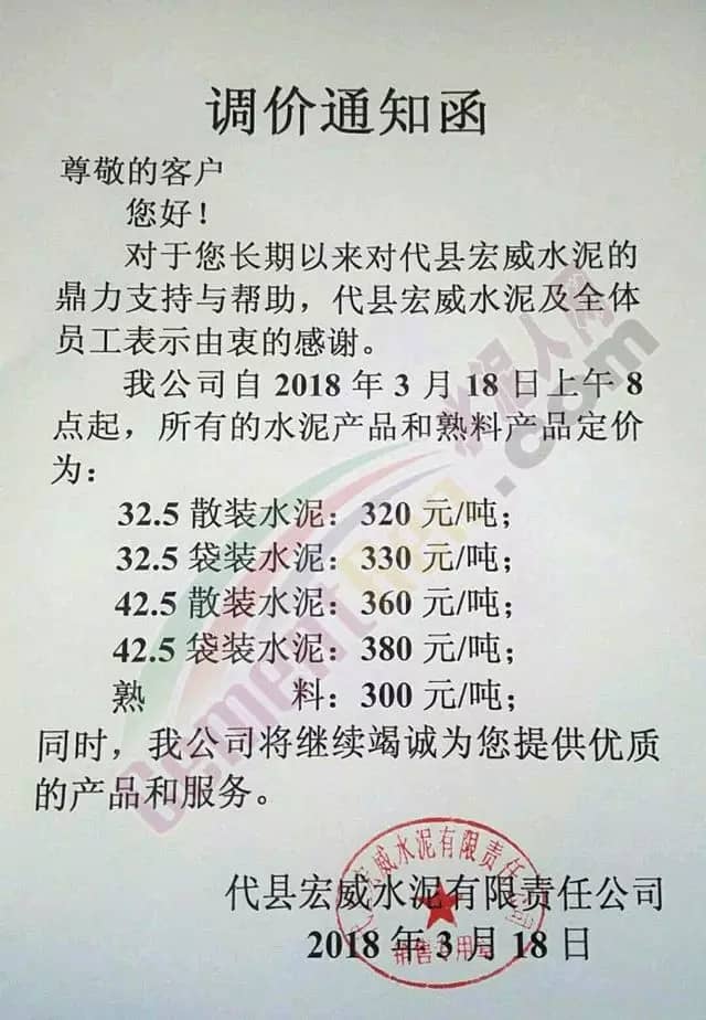 根據目前市場行情及公司產銷形勢,經研究決定:從2018年03月28日零時起各品種散裝水泥在原結算價格基礎上上調10元/噸。