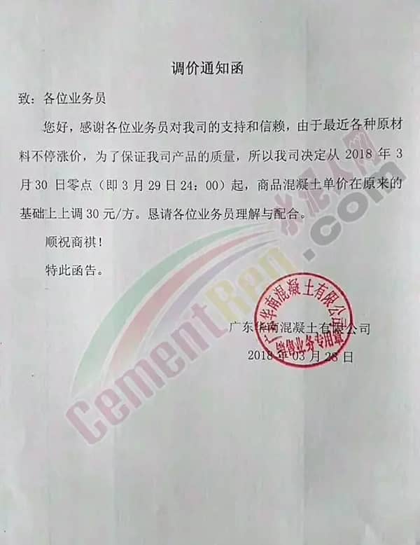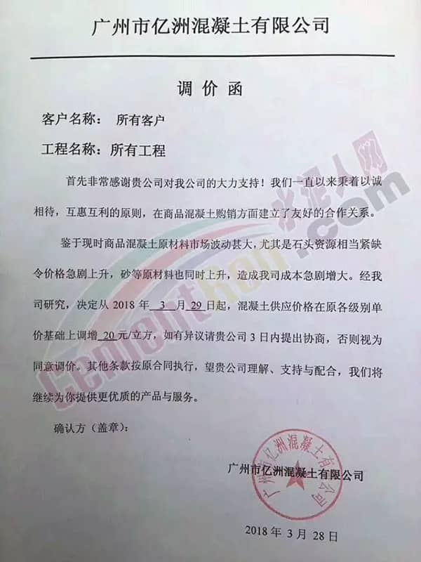 為繼續保質保量提供優質產品,從成本增加的角度考慮,自即日起混凝土企業將各品種混凝土價格在原基礎上上調,上調幅度在20元/立方~30元/立方。