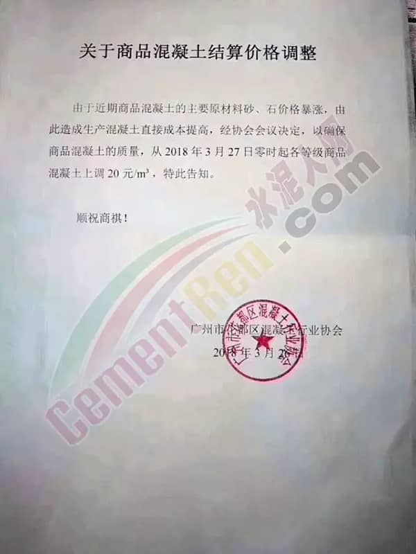 東莞市翔富混凝土有限公司《升價函》中提到,自2018年3月以來,混凝土原材料不降反升,特別是砂已連續4輪上漲,累計漲幅25元/噸,且貨源供應緊張。直接導至混凝土企業經營成本增長。