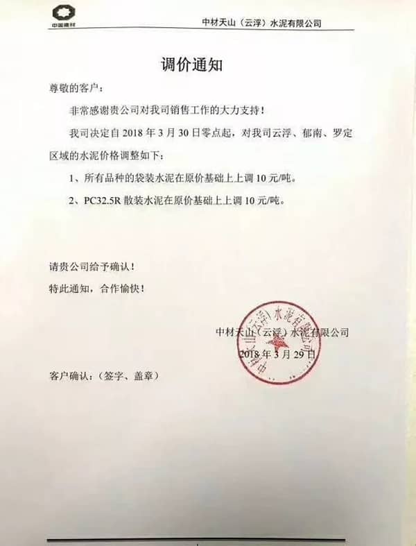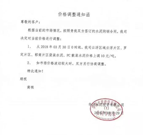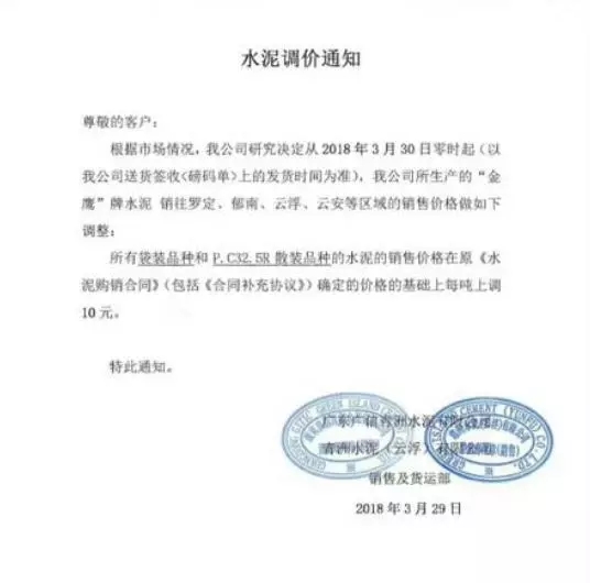 水泥人網通訊員消息,廣東省部分水泥企業也于昨日(29日)通知上調水泥價格,調價函如下:
