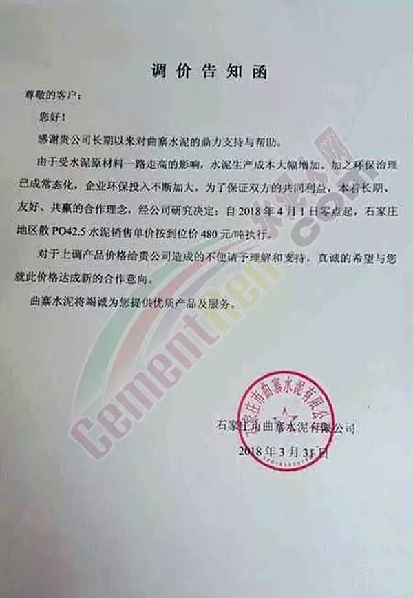 昨日,石家莊曲寨水泥也發(fā)布了提價(jià)通知,通知自2018年4月1日起石家莊地區(qū)散裝PO42.5水泥銷(xiāo)售單價(jià)按到位價(jià)480元/噸執(zhí)行。