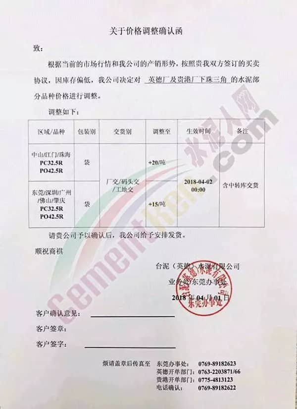 水泥人網(wǎng)通訊員消息,近兩日廣東省部分企業(yè)發(fā)布提價(jià)通知,其中臺(tái)泥水泥廠的價(jià)格調(diào)整確認(rèn)函提到因庫(kù)存偏低決定對(duì)英德廠及貴港廠下珠三角的水泥部分品種價(jià)格進(jìn)行調(diào)整。上調(diào)幅度在15~20元/噸不等。