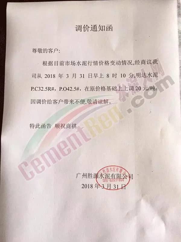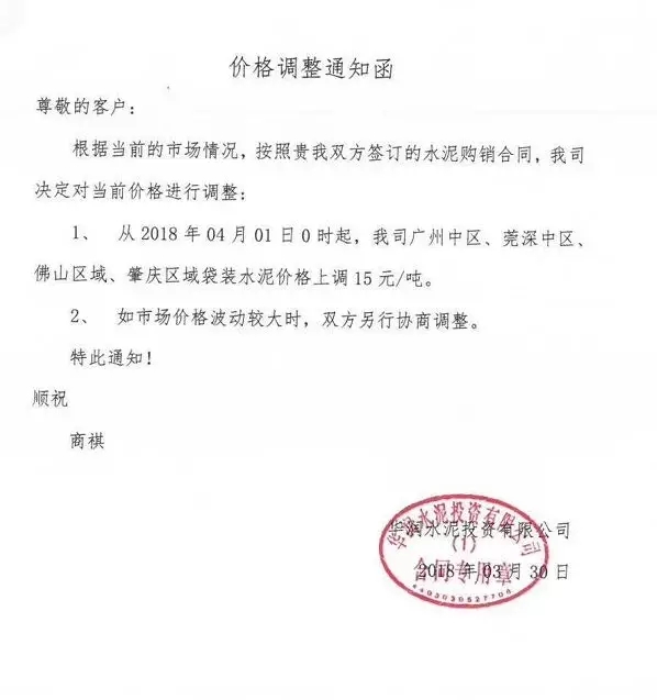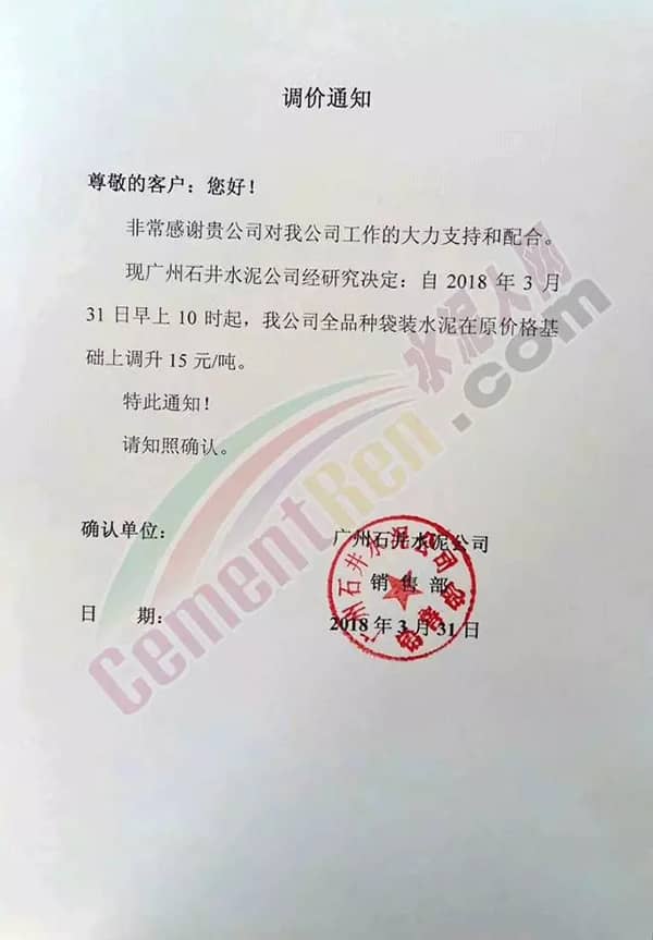 根據(jù)當(dāng)前市場(chǎng)形勢(shì)及我司生產(chǎn)情況,我公司決定于2018年3月31日上午8:00上調(diào)各品種袋裝、散裝水泥20元/噸,價(jià)格上調(diào)以我司出廠過(guò)磅時(shí)間為準(zhǔn),如您繼續(xù)安排提貨,則視為認(rèn)同此次價(jià)格調(diào)整。順祝商祺!