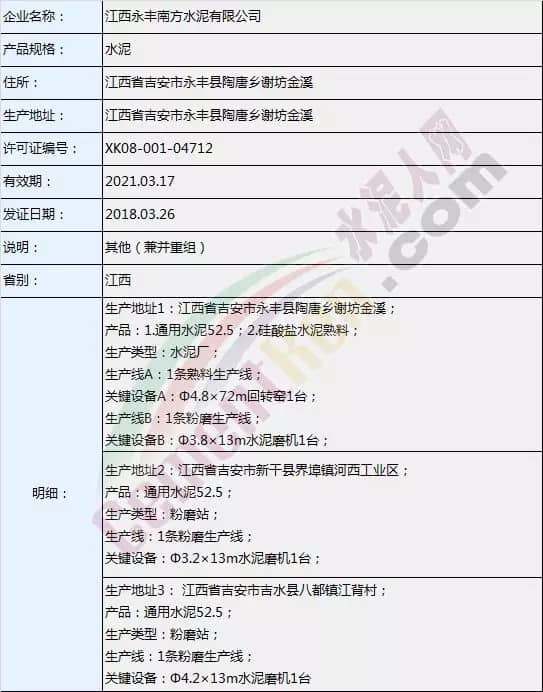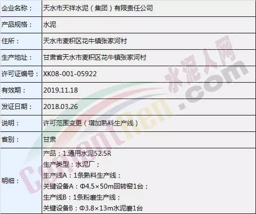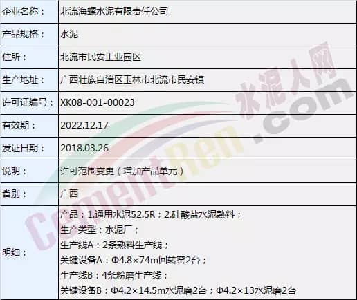 【水泥人網】2018年3月26日國家質檢總局發放3月份第4批24家水泥企業生產許可證。其中新發證書12家,到期延續7家,涉及變更的5家。其中涉及名稱變更的2家,許可證范圍變更的2家,涉及其他變更項目的1家。 一、發證 二、延續 三、變更 1、發證、名稱變更 2、其他(兼并重組) 3、許可證范圍變更(增加產品單元) 4、許可范圍變更(增加熟料生產線)