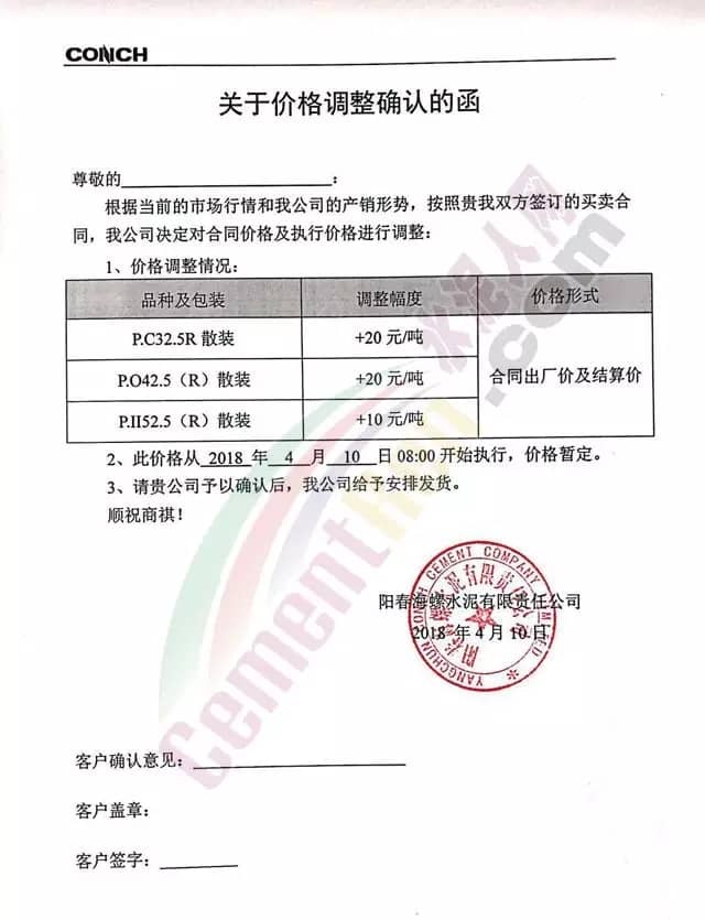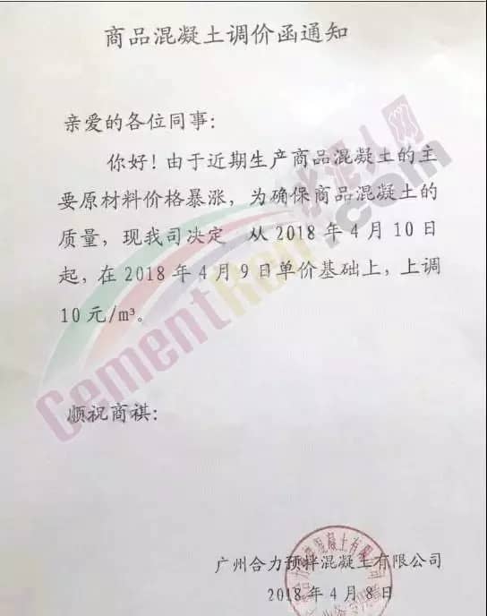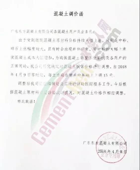 散裝、包裝全品種漲價廣東東方混凝土有限公司4月8日發布調價函稱,由于受到近期混凝土原材料價格持續大幅上漲,特別是中砂、碎石上漲幅度較大,且有時會出現斷供現象,原材料的大幅上漲,使混凝土成本大幅增加,為確保混凝土質量不受影響及各用戶的正常用砼,公司研究決定對混凝土銷售價格進行調整,自2018年4月9日零時起,每立方砼在原單價基礎上上調15元。