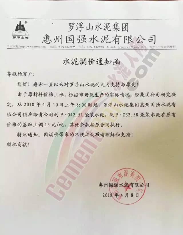 廣東區域內各企業陸續發提價通知給下游經銷商及客戶。區域內三家海螺水泥集體調價,各標號散裝水泥最高上調20元/噸。