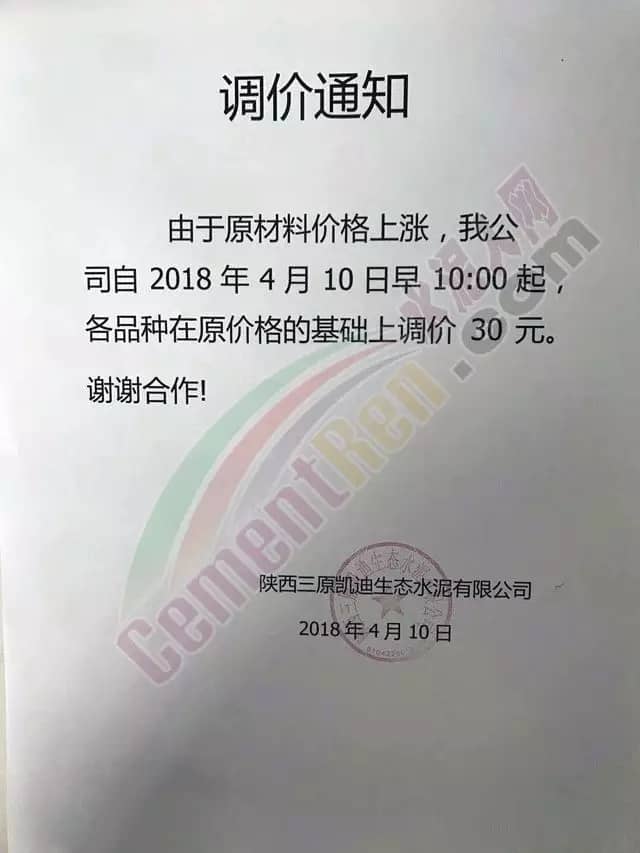 昨日陜西咸陽市粉磨站企業陜西三原凱迪生態水泥有限公司發布提價通知稱,由于原材料價格上漲,自4月10日早10點起各品種水泥在原價格的基礎上上調30元/噸。