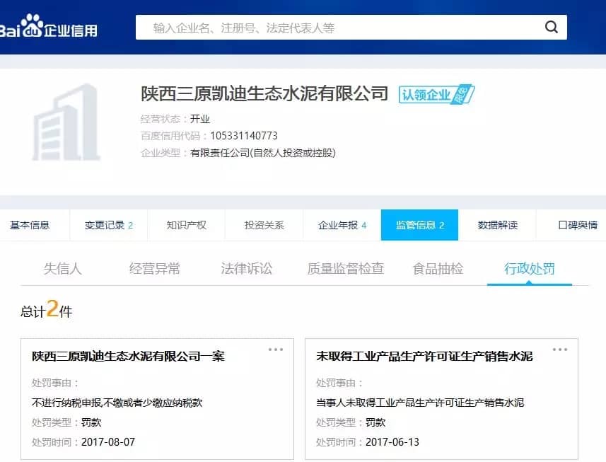 據查詢,此企業因未取得生產許可證生產銷售水泥,曾在2017年6月被罰款。