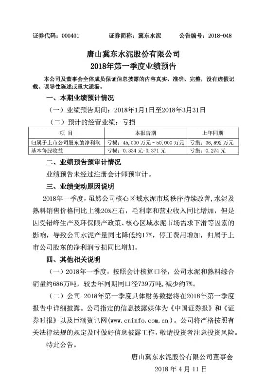 【水泥人網(wǎng)】冀東水泥(000401)4月10日晚披露業(yè)績預告,公司預計今年一季度虧損4.5億至5億元,上年同期虧損3.69億元。報告期內,公司核心區(qū)域水泥及熟料銷售價格同比上漲20%左右,但是因受錯峰生產及環(huán)保限產政策、市場需求下滑等因素的影響,導致公司水泥產量同比降低約17%,停工費用增加。