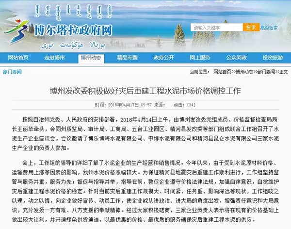 按照新疆博爾塔拉蒙古自治州黨委、人民政府的安排部署,2018年4月14日上午,由博州發改委黨組成員、價格監督檢查局局長王麗華牽頭,會同州質監局、審計局、工商局、五臺工業園區、精河縣發改委等部門組成聯合工作組召開了水泥生產企業座談會,會議邀請了博樂博海水泥有限公司、中博水泥有限公司和精河縣昆侖水泥有限公司三家水泥生產企業的負責人參加。