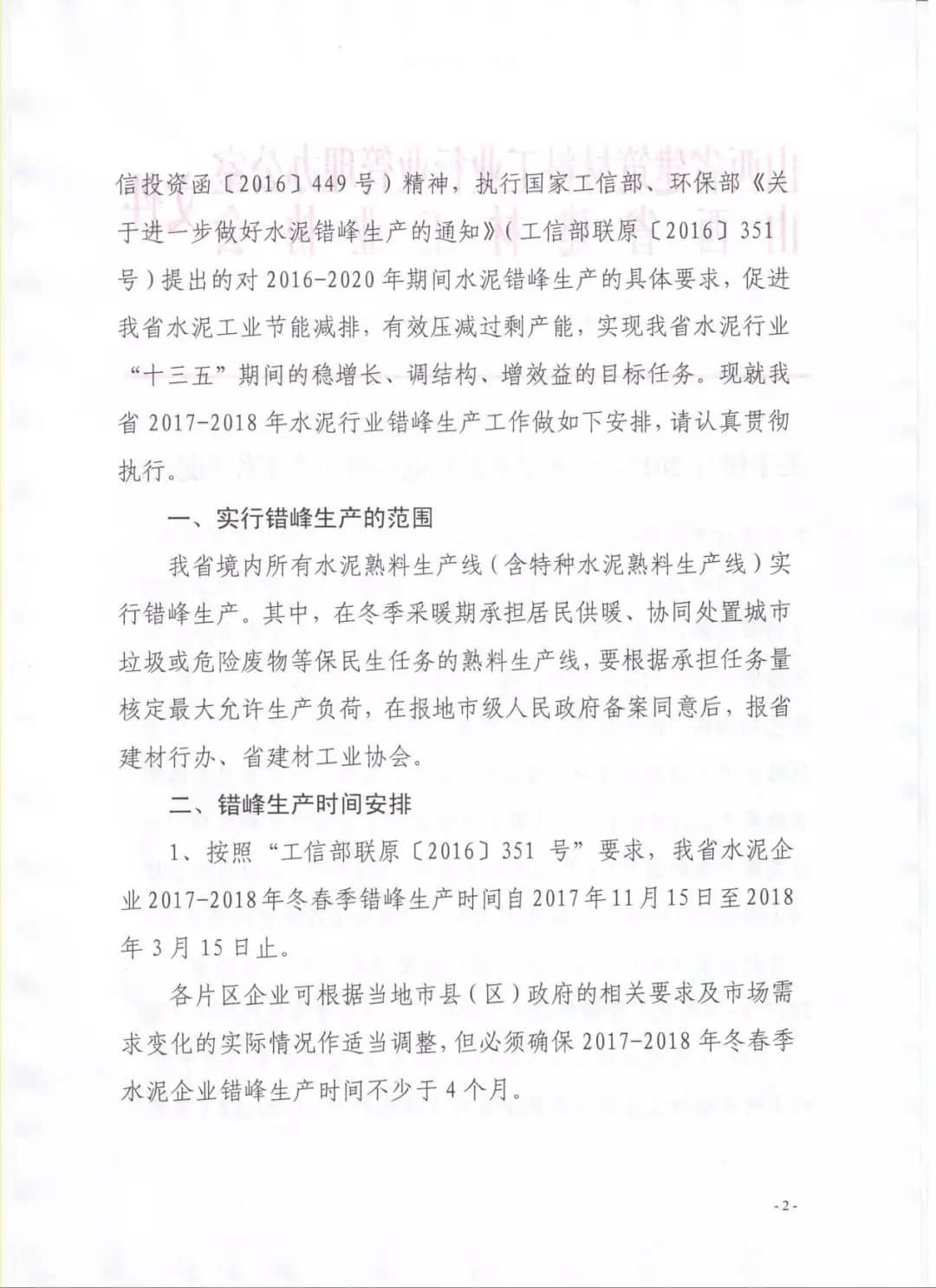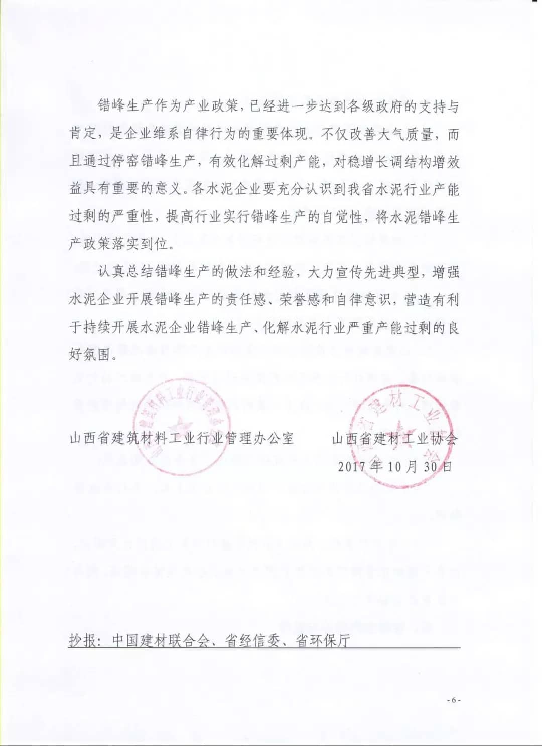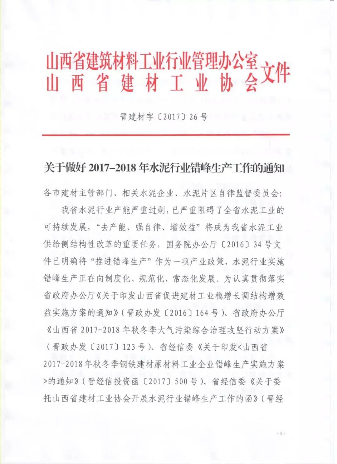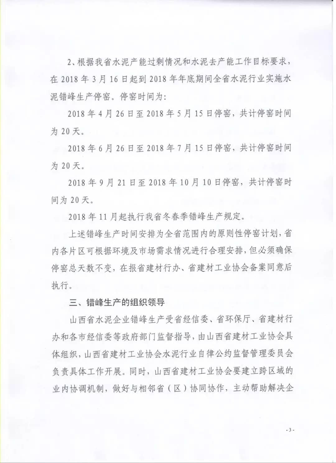 【水泥人網】據水泥人網了解,山西省根據產能過剩實際情況和水泥去產能工作目標的要求,在2018年3月16日起到2018年年底期間全省水泥行業實施錯峰生產停窯,停窯時間為: 2018年4月26日至2018年5月15日停窯,共計停窯時間為20天; 2018年6月26日至2018年7月15日停窯,共計停窯時間為20天 2018年9月21日至2018年10月10日停窯,共計停窯時間為20天; 2018年11月起執行山西省冬季錯峰生產規定。 詳情如下: