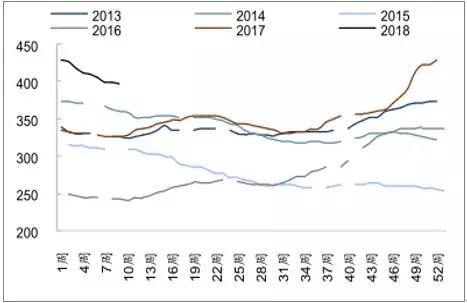 水泥年初以來價格出現季節性走弱,主要集中于華東、中南以及西南地區,其余地區價格仍然維持高位堅挺,截至3月2日,全國高標水泥平均報價 398.33元/噸,較去年同期高 21.88%,仍處于歷史高位水平。前期價格下降主要原因為,一方面南方雨雪天氣導致,下游需求減弱,另一方面為組織沿江地區進口熟料的增加,近期主要由于春節因素,下游企業尚未開工,生產商通過價格下調打開市場銷量,刺激開工后下游采購的積極性。根據過去數年春節前后水泥價格波動規律的比較可以明顯看出,農歷春節后,水泥市場價格仍將持續一段時間的低迷,待開工恢復后才出現回暖,因此近期個別區域價格仍有下探現象,屬正常。