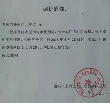 潤心固江山、豐業酬永恒!根據當前市場形勢,經公司研究決定,自2018年04月26日8:00時起,對各規格袋裝水泥、散裝水泥上調20元/噸,友情提醒:如您繼續安排車輛到我公司提貨,則視為您同意和確認此次價格調整。