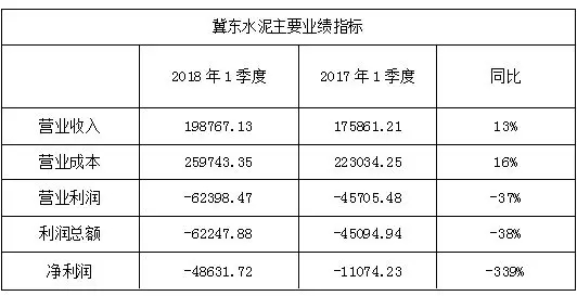 2018年一季度,雖然冀東水泥核心區域水泥市場秩序持續改善,水泥及熟料銷售價格同比上漲20%左右,毛利率和營業收入同比增加,但是因受錯峰生產及環保限產政策、核心區域水泥市場需求下滑等因素的影響,導致冀東水泥水泥產量同比降低約17%,停工費用增加,歸屬于上市公司股東的凈利潤虧損同比增加。