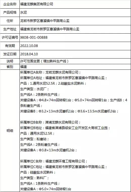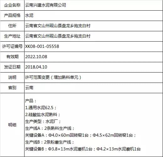 以上涉及項(xiàng)目變更及許可范圍變更的企業(yè)中,新增熟料單元及熟料生產(chǎn)線的有兩家企業(yè),分別為云南興建水泥有限公司、福建龍麟集團(tuán)有限公司。其生產(chǎn)許可證詳細(xì)如下: